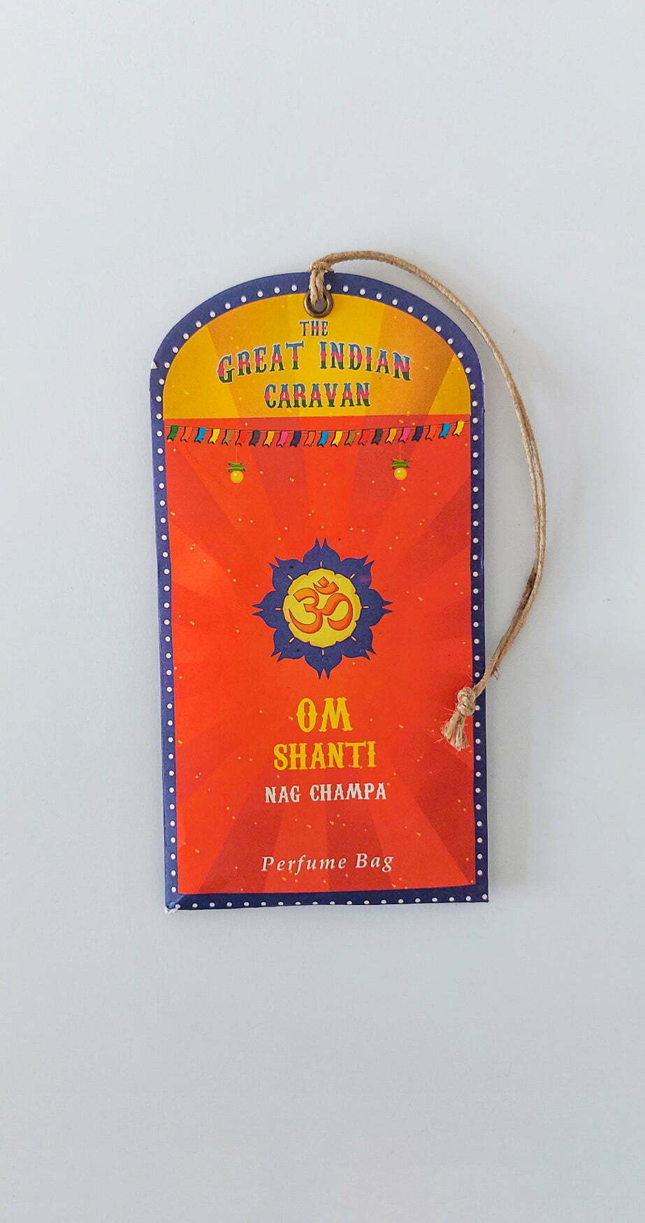 Saszetka zapachowa „Om Shanti” zawiera ręcznie sproszkowane kadzidełka i olejki eteryczne o zapachu zbieranego o poranku kwiatu świętego drzewa champa.